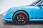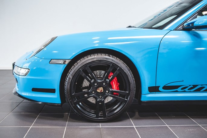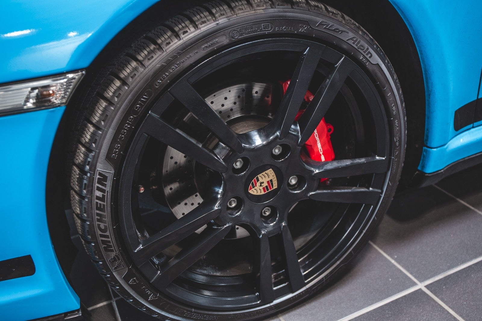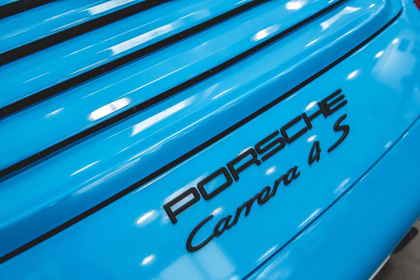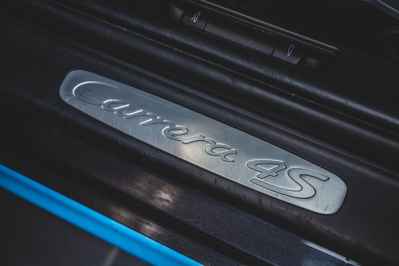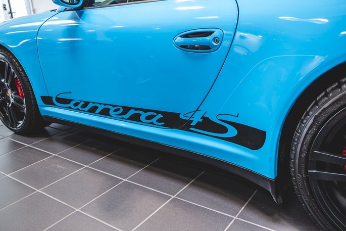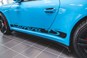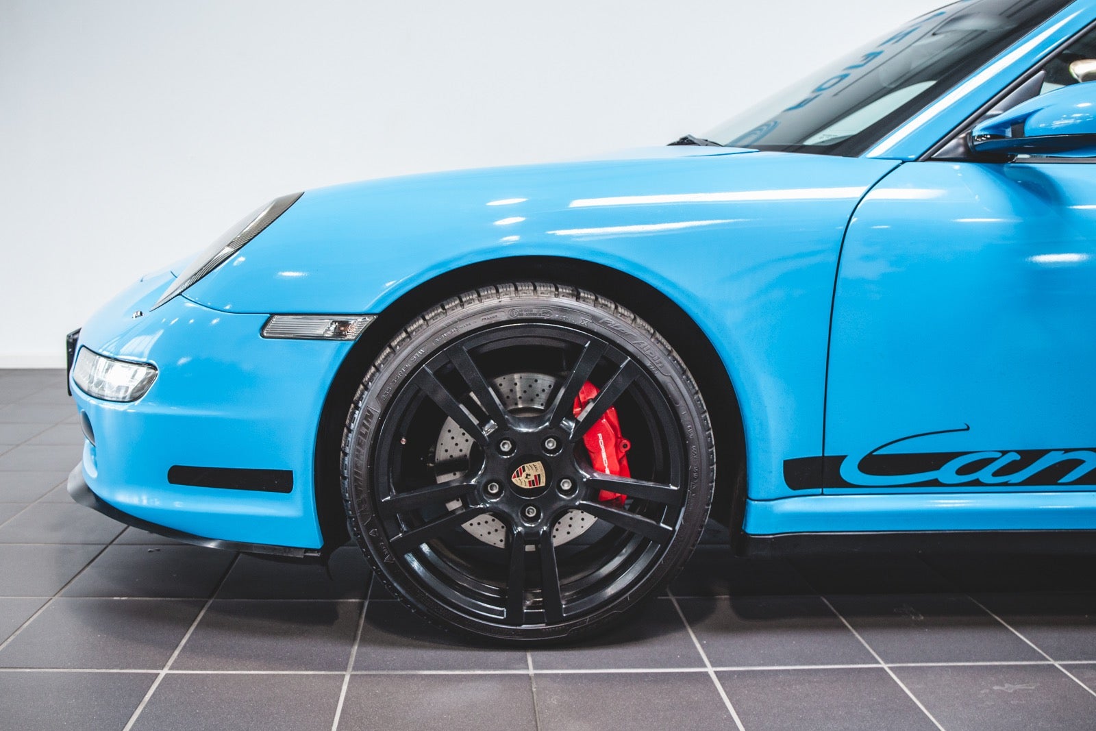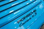 Bilen er folieret i turkis blå med sorte detaljer. Under folien er bilen sort metal. Se billede
